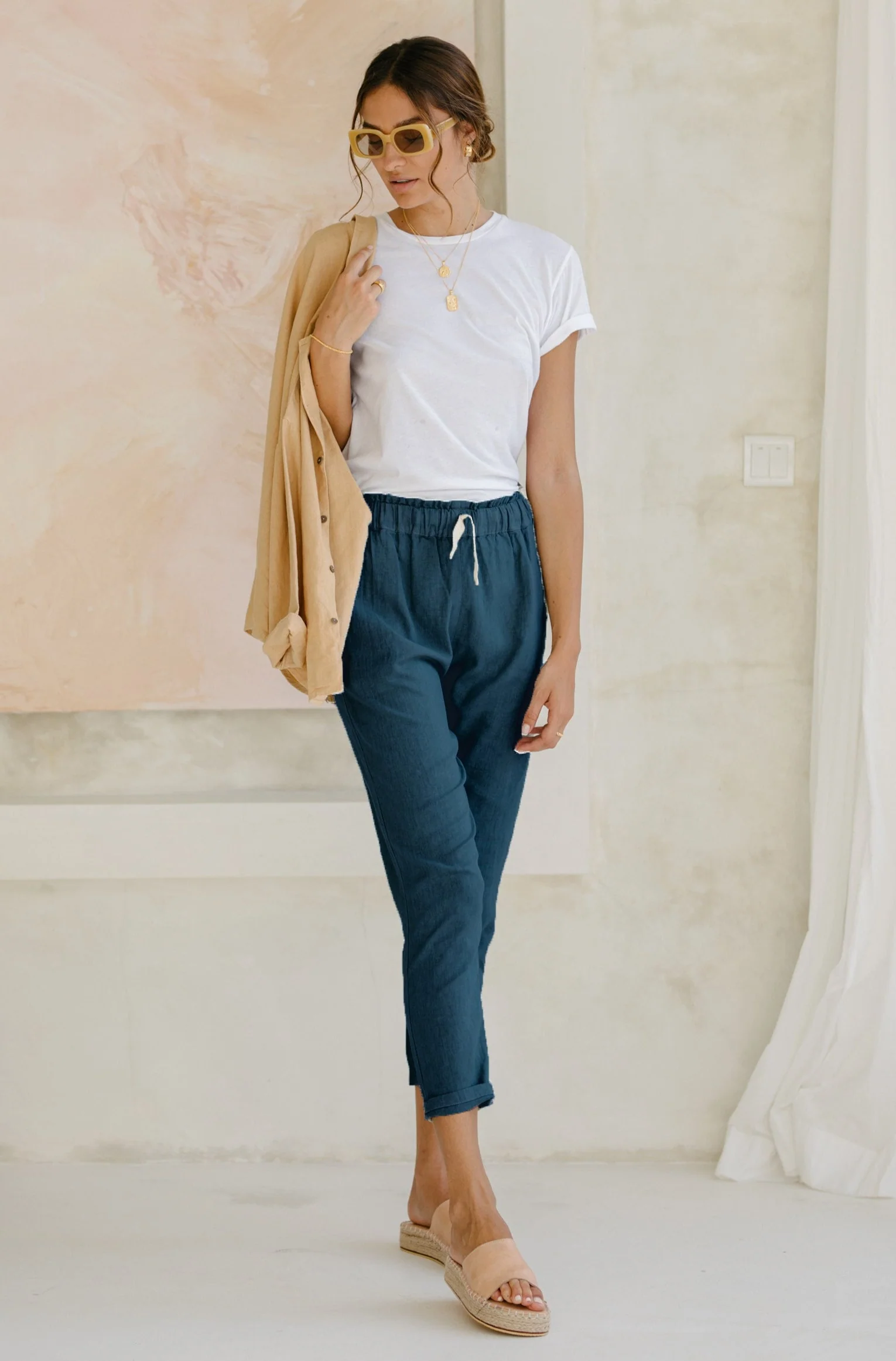 An easy to wear, stylish Linen Pant with elastic & drawstring waist. Ankle grazer length with the ability to roll up to style. Designed for all body shapes in mind, including growing bumps! Side pockets for those extra snacks, keys & all things fun...