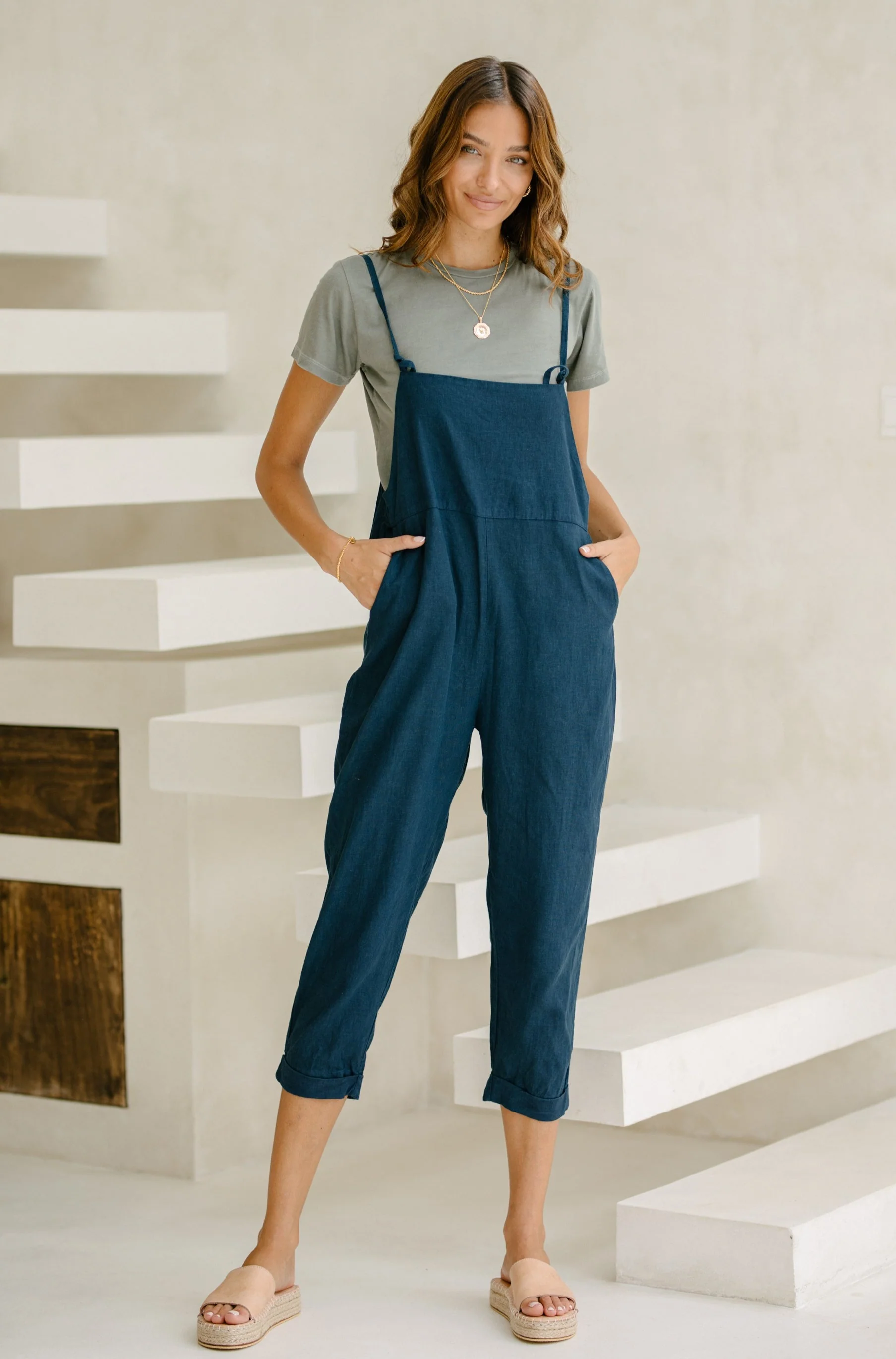 \nAn OH SO COMFY stylish Linen overall that you may well be living in well into your 80's (just sayin'). These overalls have been dyed with organic plant dyes (hello soft smooth toxic-free skin!) and they have simple tie straps meaning you can style the height to sit how you like on your specific body & personal style - GENUIS huh? Yeah we thought so too. They also sit at ankle grazer length with the ability to roll up to style and include x2 side pockets for those extra snacks, keys & all things fun...