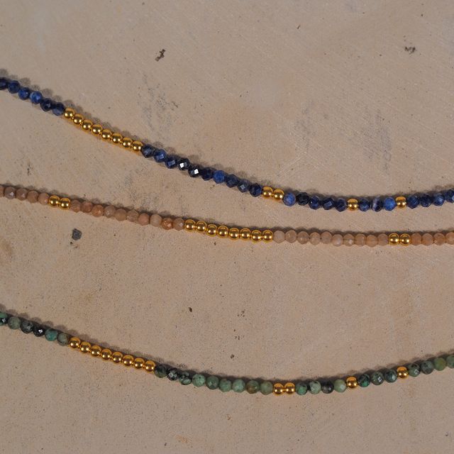 Cool, calm and quietly striking. This necklace is strung with faceted Sodalite beads that catch the light in deep, inky blues, finished with Gold beads scattered throughout for a touch of contrast & shine.
