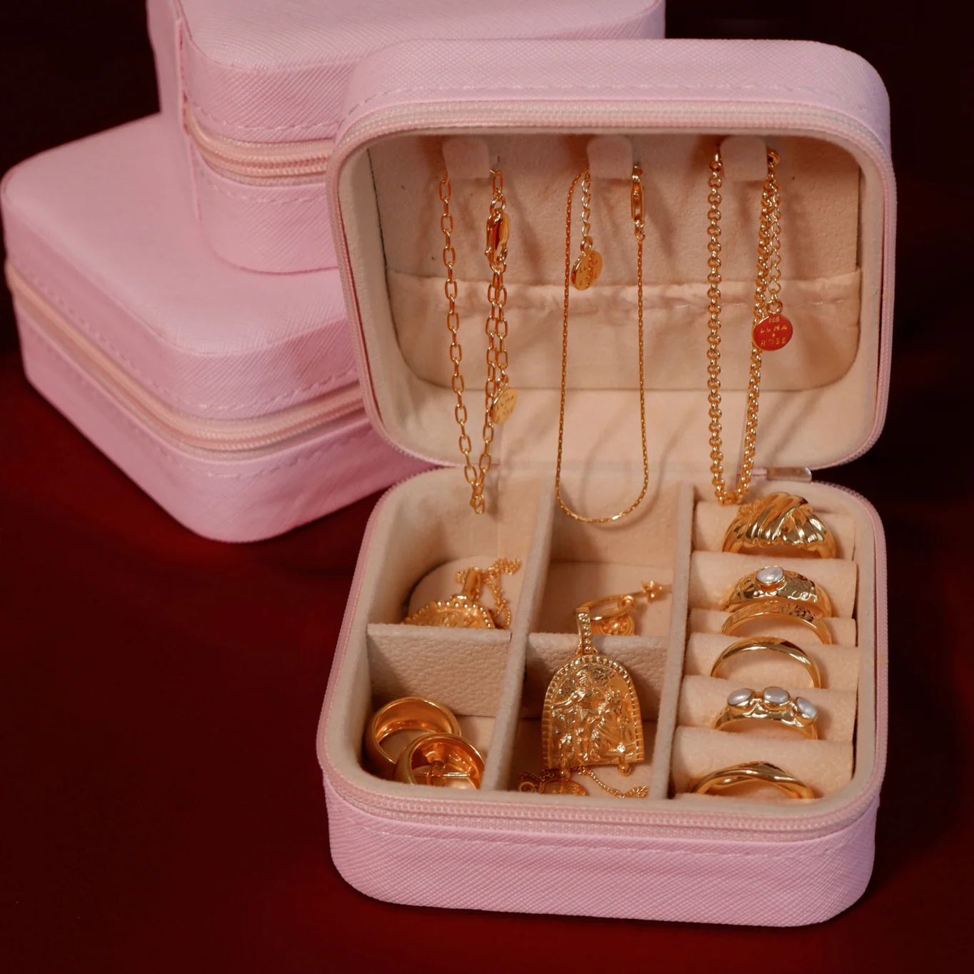 Its compact size makes it ideal for travel, slipping easily into your suitcase or handbag. The soft, plush interior safeguards your jewellery from scratches & damage, while the elegant pink exterior adds a touch of sophistication. Whether you're jet-setting, using this case to store & organise your jewellery at home or simply heading out for the day, this case is a stylish & practical choice for keeping your accessories in pristine condition.